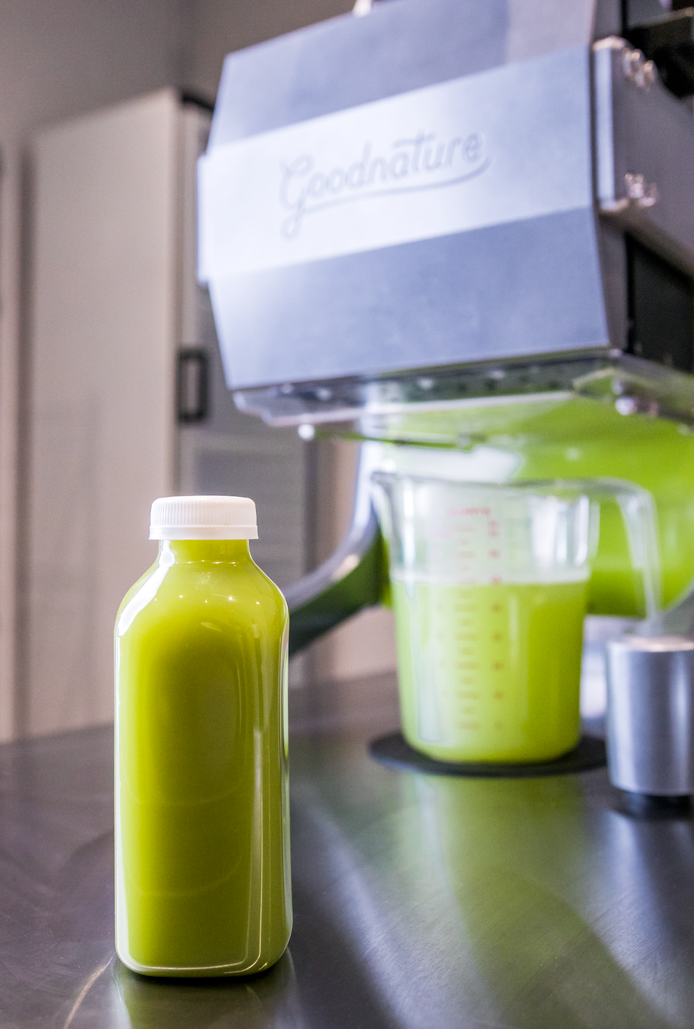 We juice several times a week and stock our front-of-house refrigerator with 16-ounce bottles of our house-made cold-pressed juices.
